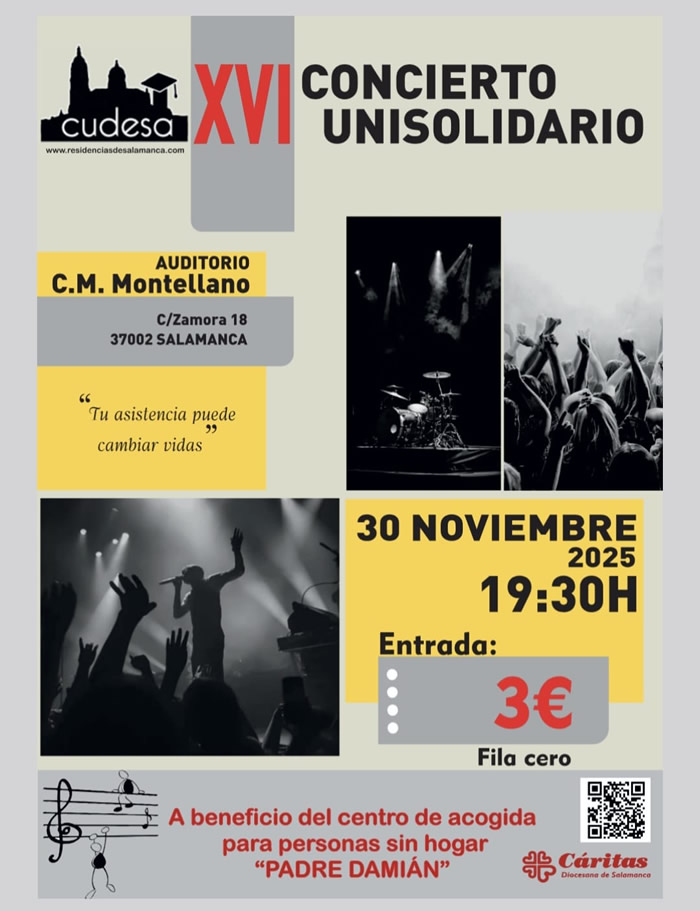 El Concierto Unisolidario CUDESA en el Colegio Mayor Montellano C/ zamora Nº 18 Salamanca, el día 30 de Noviembre de 2025 a las 19:30 con una entrada solidaria y fila 0 de 3€ por persona.